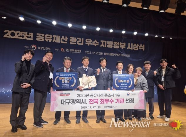 뉴스펀치 조평훈 기자 | 대구광역시는 12월 22일 행정안전부 주최 ‘2025년 공유재산 우수 지방자치단체 시상식’에서 공유재산 총조사 부문 최우수 기관 선정과 더불어, 공유재산 우수사례 경진대회에서 우수상(장관상)을 수상하는 등 공유재산 관리와 활용 분야에서 최고 수준의 역량을 입증했다.
