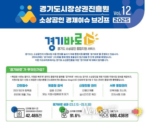 뉴스펀치 김길룡 기자 | 경기도시장상권진흥원은 22일, 도내 소상공인의 행정 편의와 정보 접근성을 높이기 위해 운영 중인 경기도 소상공인 종합지원 서비스 ‘경기바로’의 현황과 향후 개선 방향을 담은 「경기도 소상공인 경제 이슈 브리프 VOL.12」을 발간했다고 밝혔다.