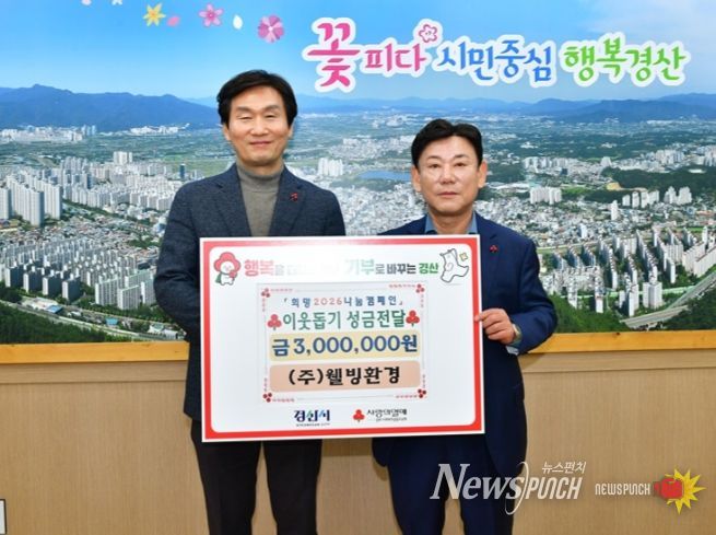 뉴스펀치 김길룡 기자 | 경산시는 ㈜웰빙환경(대표이사 박상희)이 12월 19일 이웃돕기 성금 및 인재 육성을 위한 장학금 총 500만 원을 기탁했다고 밝혔다.