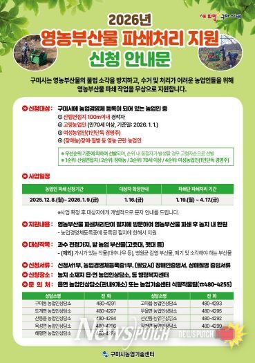 뉴스펀치 김길룡 기자 | 구미시는 영농부산물 불법소각으로 인한 미세먼지 발생과 산불 위험을 줄이기 위해 ‘2026년 영농부산물 안전처리 지원사업’을 본격 추진한다. 이번 사업은 '미세먼지 저감 및 관리에 관한 특별법'과 '구미시 영농부산물 안전처리 지원 조례'에 근거해 시행되며, 영농부산물 파쇄 작업을 무상으로 지원해 농업인의 작업 부담을 낮추고 친환경 농업환경을 조성하는 데 목적이 있다.