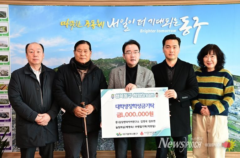 뉴스펀치 조평훈 기자 | 김상연타이어연구소(대표 김상연), 영일기획(대표 박중일), 놀빛화실(대표 배영숙)은 지난 22일, 동구청을 방문해 지역 내 어려움을 겪고 있는 저소득 대학생을 위해 장학 성금 100만원을 기탁했다.