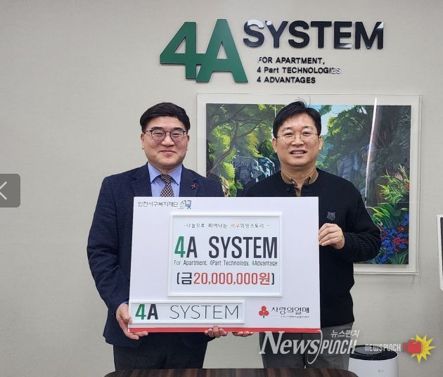 뉴스펀치 김길룡 기자 | (주)포에이시스템(대표 김소중)은 지난 22일 인천서구복지재단(이사장 강범석)에 취약계층을 위한 지원사업을 위하여 2천만 원을 기탁했다.