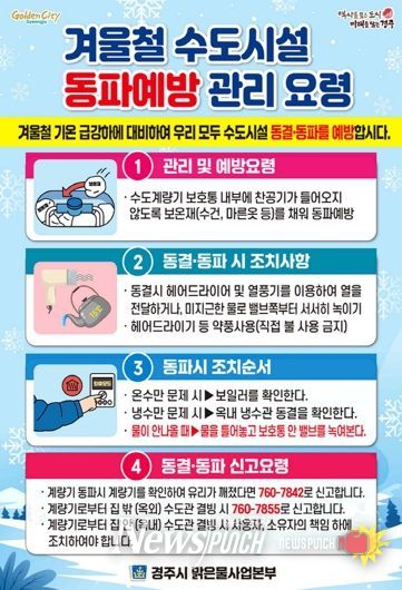 뉴스펀치 김길룡 기자 | 경주시는 겨울철 수도시설 동파 피해를 예방하기 위해 종합 대응대책을 수립하고 대응에 나선다고 23일 밝혔다.