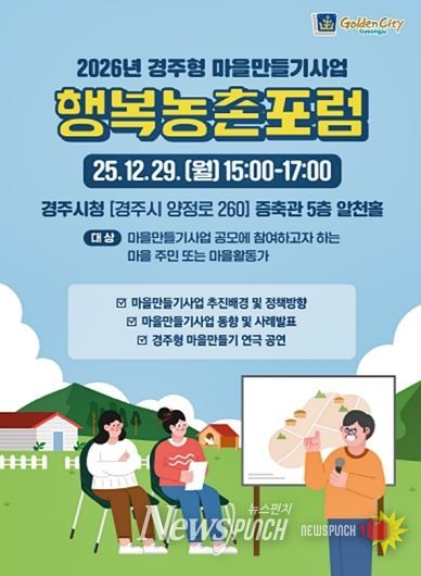 뉴스펀치 김길룡 기자 | 경주시가 오는 29일 오후 3시부터 5시까지 청內 알천홀에서 주민·전문가·행정이 함께 참여하는 ‘경주시 마을만들기 행복농촌포럼’을 개최한다.