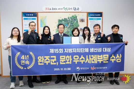 뉴스펀치 정홍균 기자 | 완주군이 ‘무장애 문화’를 행정 전반에 접목한 정책 성과를 인정받아, 행정안전부가 주최하고 한국생산성본부가 주관한 ‘제15회 지방자치단체 생산성대상’ 문화분야에서 기관표창을 수상했다.