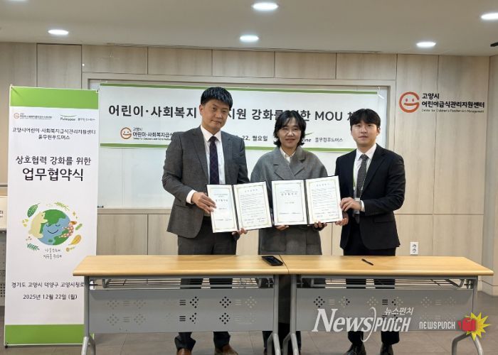 뉴스펀치 김길룡 기자 | 고양특례시에서 위탁 운영하고 있는 고양시 어린이·사회복지급식관리지원센터는 지난 22일 풀무원 푸드머스와 업무협약(MOU)을 체결하고, 고양시 관내 어린이·사회복지 급식소의 위생·안전 및 영양관리 수준 향상을 위해 상호 협력하기로 했다.