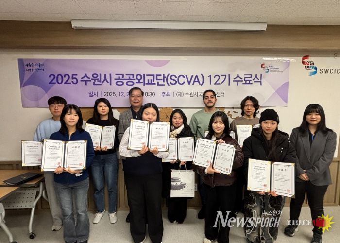 뉴스펀치 김길룡 기자 | 수원시국제교류센터가 22일 센터에서 ‘수원시 공공외교단(SCVA) 12기’ 수료식을 열고, 단원 16명에게 수료증을 전달했다. 우수활동자 4명에게는 상장을 수여했다.