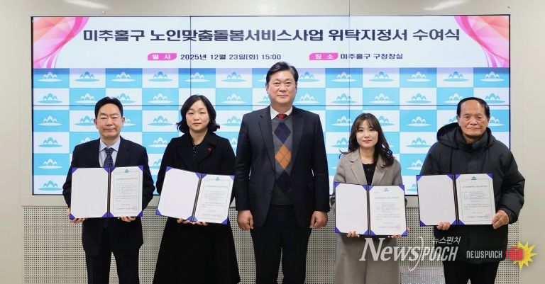 뉴스펀치 김길룡 기자 | 인천 미추홀구는 23일 구청장실에서 ‘노인 맞춤 돌봄서비스 사업 위탁지정서 수여식’을 개최했다.