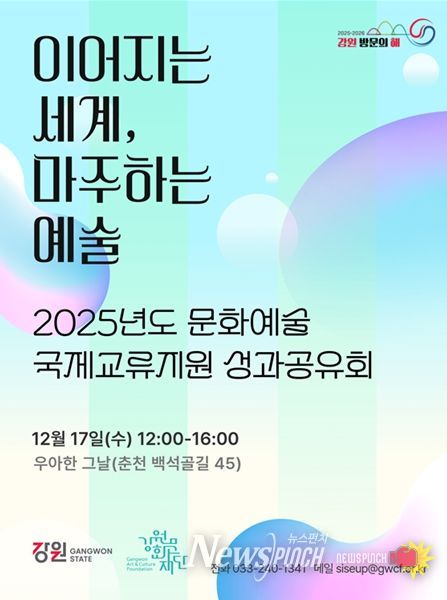 뉴스펀치 김길룡 기자 | 강원문화재단은 2025년도 문화예술 국제교류지원사업에 참여한 예술인들과 함께 12월 17일 춘천에서 성과공유회 '이어지는 세계, 마주하는 예술' 행사를 성황리에 마무리했다고 밝혔다.