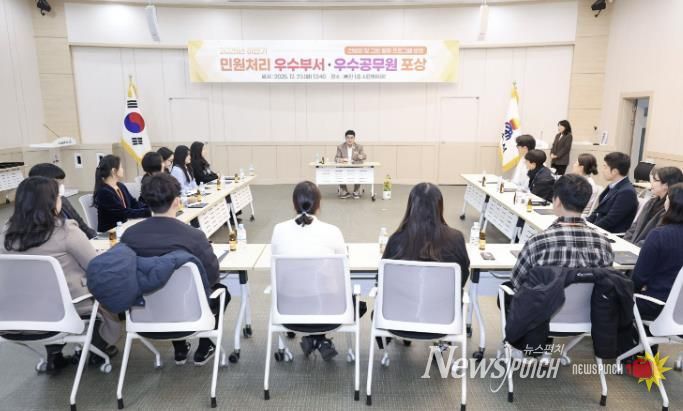 뉴스펀치 김길룡 기자 | 삼척시는 12월 23일 시청 시민회의장에서 2025년 하반기 민원처리 우수부서와 우수공무원에 대한 포상식을 개최하여 민원 서비스 향상에 기여한 직원들을 격려했다.