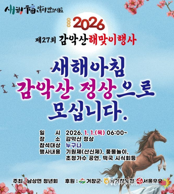 뉴스펀치 김길룡 기자 | 거창군은 병오년(丙午年) 새해를 맞아 군민의 안녕과 지역 발전을 기원하는 '제27회 감악산 해맞이 행사'를 2026년 1월 1일 오전 6시부터 9시까지 감악산 정상에서 개최한다.