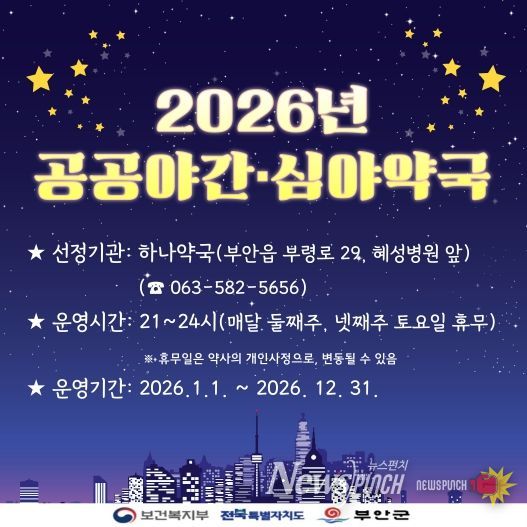 뉴스펀치 김길룡 기자 | 부안군은 2026년에도 군민들의 건강 보호 강화를 위해 공공심야약국을 운영한다고 발표했다.