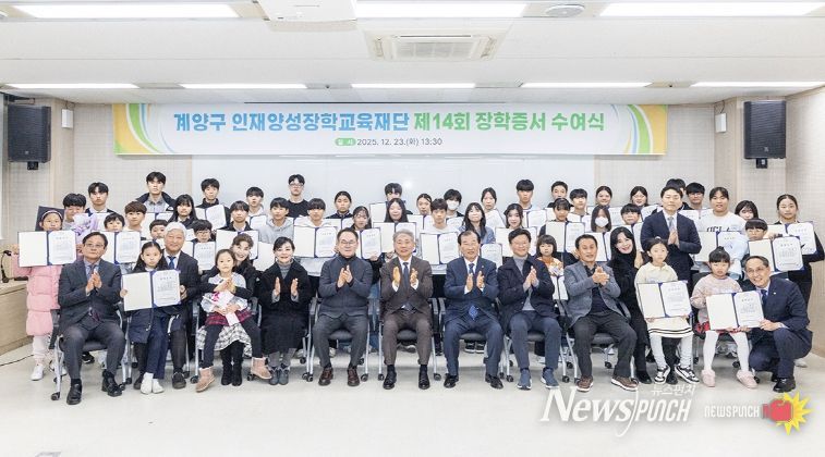 뉴스펀치 김길룡 기자 | (재)인천광역시 계양구 인재양성장학교육재단(이사장 이노경)은 12월 23일 지역 인재 발굴과 육성을 위해 제14회 장학생 132명을 선발해 장학증서를 수여했다고 밝혔다.
