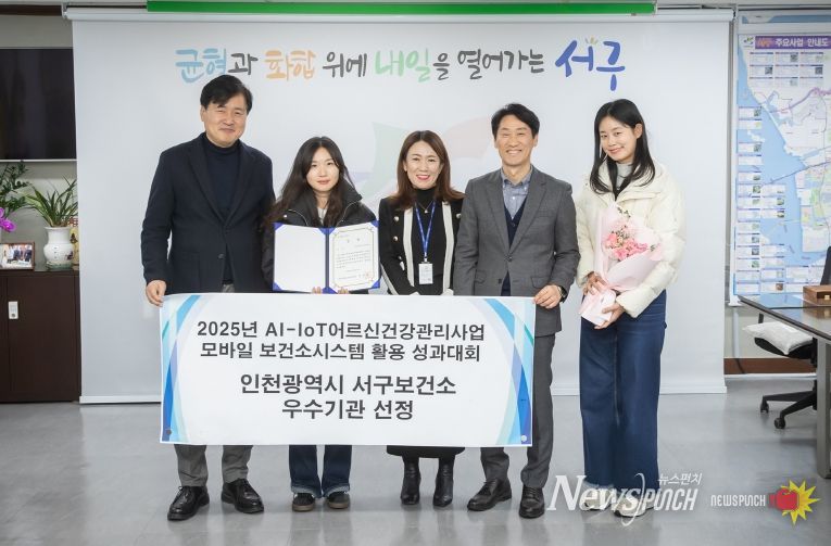 뉴스펀치 김길룡 기자 | 인천 서구보건소는 한국사회보장정보원이 주최한 ‘2025년 모바일 보건소 활용 성과대회’에서 AI-IoT기반 어르신 건강관리사업 운영 성과를 인정받아 우수기관으로 선정됐다고 밝혔다.
