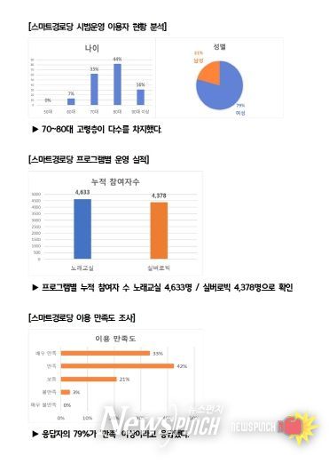 이용자 설문조사 결과에서도 긍정적인 반응이 이어졌다. 응답자의 96%가 사업 운영에 대해 긍정적(만족 이상 75%, 보통 21%)이라고 답했으며, 79%는 이후에도 계속 이용하겠다는 의사를 밝혔다. 이를 통해 사업의 지속 필요성이 확인됐고, 참여자 대부분이 70~80대 고령층으로 스마트경로당이 디지털 취약계층을 대상으로 효과적으로 운영된 것으로 분석됐다.