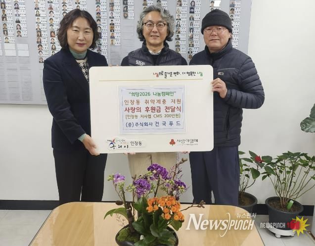 뉴스펀치 김길룡 기자 | 구리시 인창동 행정복지센터는 지난 12월 23일 인창동에 소재한 ㈜건국푸드로부터 취약계층 지원을 위한 후원금 200만 원을 지정 기탁받았다고 밝혔다.