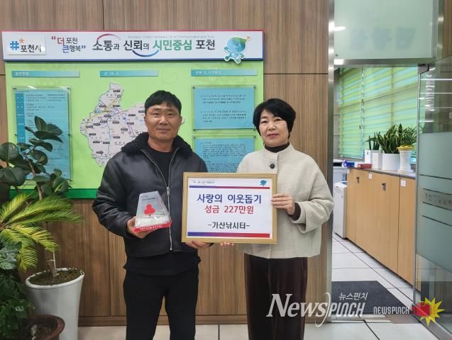 뉴스펀치 김길룡 기자 | 포천시 가산면 행정복지센터는 지역 내 소외계층 지원을 위해 가산낚시터가 성금 227만 원을 기탁했다고 밝혔다.