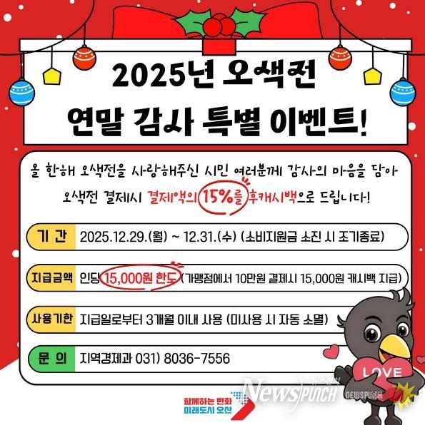 뉴스펀치 김길룡 기자 | 오산시는 한 해 동안 지역화폐를 이용해 준 시민들에게 감사의 뜻을 전하고, 연말 소비 활성화를 도모하기 위해 ‘2025년 오색전 연말 감사 특별 이벤트’를 추진한다.