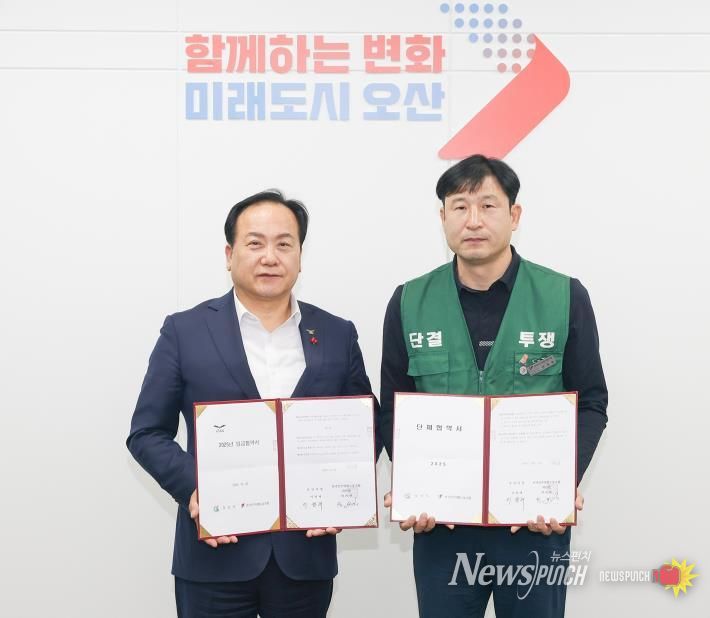 뉴스펀치 김길룡 기자 | 오산시는 지난 22일 시장 집무실에서 전국민주연합노동조합 오산지부와 2025년 임금·단체협약을 체결했다고 밝혔다. 이날 협약식에는 노사 양측 교섭위원 7명이 참석했다.
