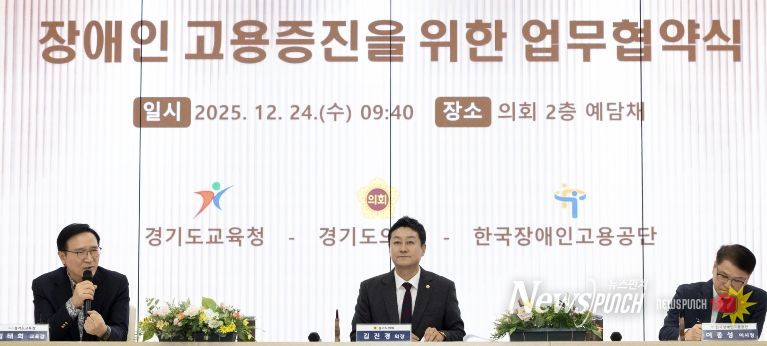 뉴스펀치 김길룡 기자 | 경기도교육청이 24일 경기도의회 예담채에서 경기도의회(의장 김진경), 한국장애인고용공단(이사장 이종성)과 함께 장애인 고용증진을 위한 업무협약을 체결했다.
