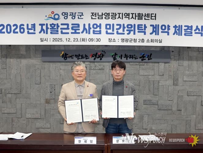 뉴스펀치 김길룡 기자 | 영광군은 12월 23일 영광군청 2층 소회의실에서 전남영광지역자활센터와 2026년 자활근로사업 민간위탁 및 개인정보처리 위탁 계약을 체결했다고 밝혔다.