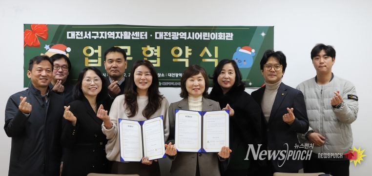 뉴스펀치 김길룡 기자 | 대전광역시어린이회관(관장 윤지원)과 대전서구지역자활센터(센터장 김선경)가 12월 24일, 지역 내 취약계층의 자립 지원과 아동 문화 서비스 확대를 위한 업무협약(MOU)을 체결했다.