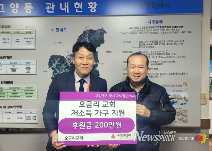 뉴스펀치 김길룡 기자 | 고양특례시 덕양구 고양동은 지난 23일 오금리교회에서 경제적 어려움을 겪는 이웃을 돕기 위해 고양동 지역사회보장협의체에 후원금 200만 원을 기탁했다고 밝혔다.