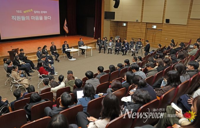 뉴스펀치 정홍균 기자 | 문화체육관광부 최휘영 장관은 새해를 맞이해 1월 5일 오전 정부세종청사 15동 대강당에서 문체부 직원들과 함께 ‘업무 효율화를 위한 직원과의 대화(타운홀 미팅)’를 진행했다.