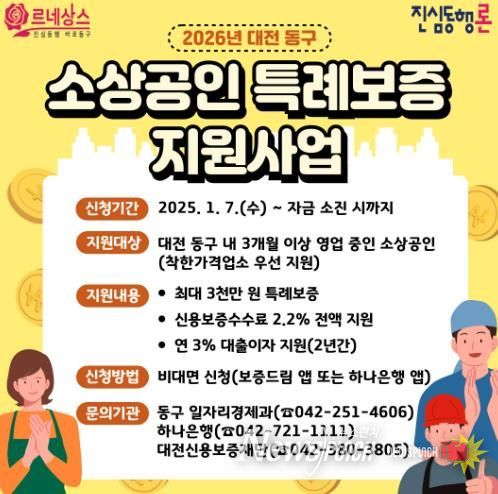 뉴스펀치 이현승 기자 | 대전 동구는 경기 침체와 고금리 기조로 경영에 어려움을 겪고 있는 지역 소상공인을 지원하기 위해 ‘2026년 소상공인 특례보증 지원사업(진심동행론)’을 본격 시행한다고 6일 밝혔다.