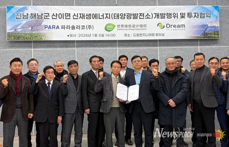 파라솔라코(주)(대표 고창열)와 (주)드림엔지니어링(대표 오진택)은 2026년 1월 6일 오후 4시, 드림엔지니어링 본사 회의실에서 ‘해남군 산이면 태양광발전소 개발허가 및 솔라시도 타운 조성 협약식’을 개최했다고 밝혔다.