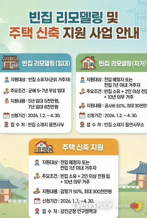 신청 접수는 2026년 1월 19일부터 2월 27일까지 강진군청 인구정책과에서 진행되며, 신청 당시 이미 착공했거나 완공된 주택은 대상에서 제외된다.
