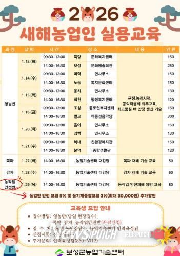 뉴스펀치 김용희 기자 | 보성군은 오는 1월 13일부터 29일까지 새해 영농을 앞둔 농업인을 대상으로 체계적인 영농계획 수립을 지원하고, 2026년 핵심 농업정책과 지역 맞춤형 재배기술을 공유하기 위하여‘새해농업인 실용교육’을 실시한다고 밝혔다.