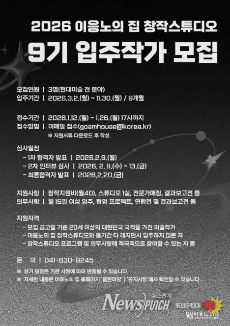 이번 9기 입주작가는 총 3명을 선발하며, 장르 제한 없이 현대미술 전 분야의 작가가 지원할 수 있다. 선정된 작가들은 오는 3월부터 11월까지 약 9개월간 이응노의 집 창작스튜디오에 입주해 창작 및 거주 공간을 지원받는다. 이와 함께 월 40만 원의 창작지원비, 전문가 매칭 프로그램, 레지던시 연합전 참여, 결과보고전 개최 등 다양한 창작 지원 프로그램이 제공된다.