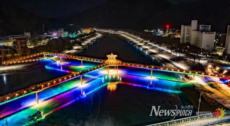 뉴스펀치 이현승 기자 | 연일 이어진 한파로 괴산군 성황천과 동진천이 얼어붙은 가운데, 두 하천을 잇는 에코브릿지의 경관조명이 얼음 위에 반영돼 겨울밤 수변에 이색적인 풍경을 연출하고 있다.