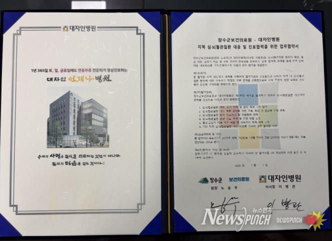 뉴스펀치 최영남 기자 | 장수군은 대자인병원과 심뇌혈관질환 발생 시 신속하고 효과적인 대응을 위해 상호 진료협력 체계를 구축하는 ‘심뇌혈관질환 대응 진료협력 협약(MOU)’을 체결했다고 9일 밝혔다.