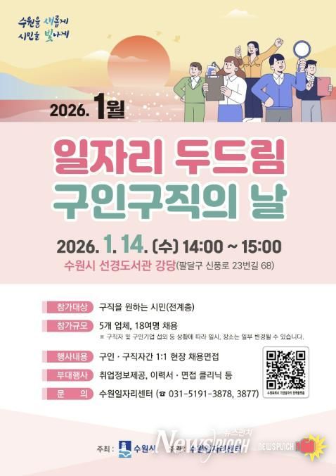 뉴스펀치 박상훈 기자 | 수원특례시는 1월 14일 오후 2시부터 3시까지 선경도서관 강당에서 ‘1월 일자리 두드림 구인·구직의 날’ 채용 행사를 연다.