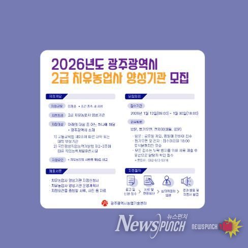 뉴스펀치 김용희 기자 | 광주광역시 농업기술센터는 12일부터 30일까지 ‘2급 치유농업사 양성기관’ 지정을 위한 신청을 받는다.