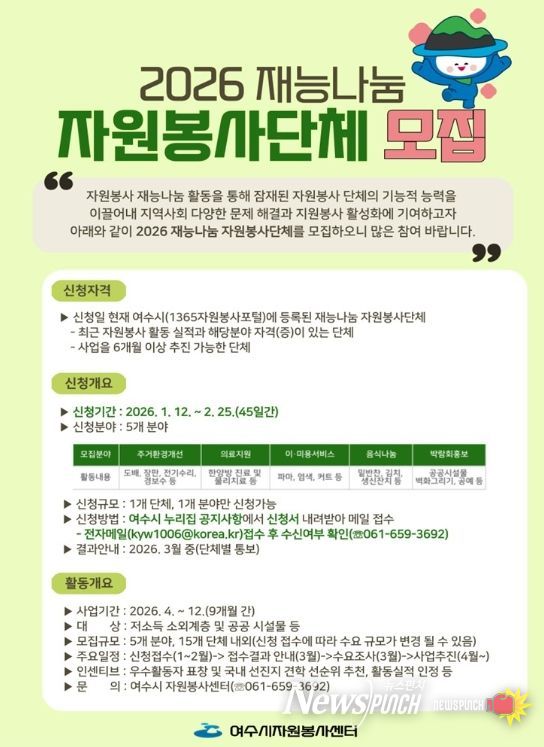 뉴스펀치 김용희 기자 | 여수시는 오늘(12일)부터 오는 2월 25일까지 ‘2026년 찾아가는 재능나눔 프로그램’에 참여할 자원봉사 단체를 모집한다.