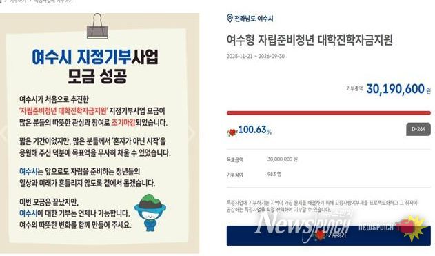 시 관계자는 “여수 고향사랑기부제에 적극 참여해 준 모든 기부자분들께 깊이 감사드린다”라며, “세제 혜택이 더욱 확대되는 만큼, 앞으로도 많은 분들이 여수시와 소중한 인연을 맺고 지역 발전에 동참할 수 있도록 매력적인 답례품과 기부자가 공감하는 기금 사업을 지속적으로 발굴해나가겠다”라고 밝혔다.