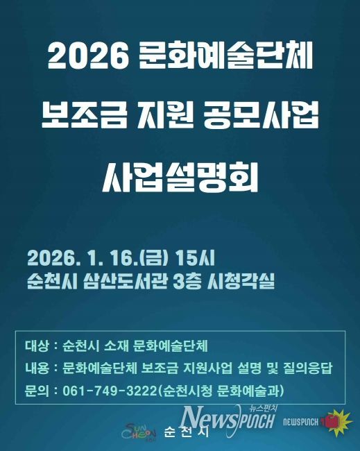 뉴스펀치 김용희 기자 | 순천시는 오는 16일 오후 3시, 삼산도서관 3층 시청각실에서 순천시 문화예술단체를 대상으로 ‘2026년 순천시 문화예술단체 보조금 지원사업 설명회’를 개최한다고 밝혔다.
