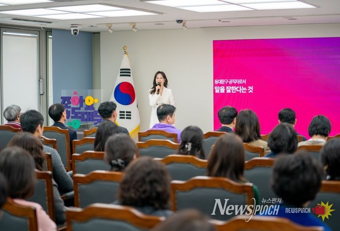 뉴스펀치 박상훈 기자 | 서울 동대문구는 14일 구청 5층 기획상황실에서 구청장과 6급 팀장 이상 관리자를 대상으로 ‘스피치 역량 강화 특강’을 열었다. 정책 설명과 내부 소통, 대민 응대 등 행정 현장에서 관리자의 말 한마디가 곧 조직의 신뢰로 이어지는 만큼, 공적 커뮤니케이션의 기본기를 점검하고 현장 적용력을 끌어올리기 위한 자리였다.