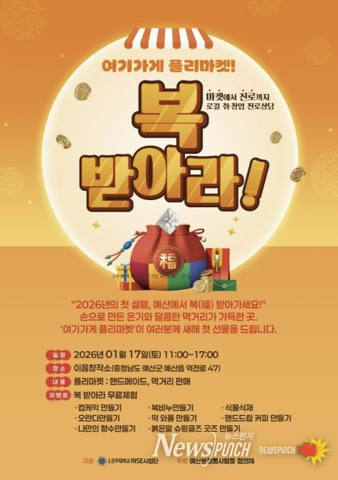 플리마켓은 오전 11시부터 오후 5시까지 ‘2026년의 첫 설렘, 예산에서 복(福) 받아가세요’를 주제로 진행되며, △지역 소상공인 21개소가 참여하는 핸드메이드 제품 및 로컬 푸드 판매 △컵케이크·오란다·떡 와플·향수·복비누·굿즈 만들기 등 9종의 무료 체험 프로그램 △로컬 취·창업 진로 상담 등으로 구성된다.