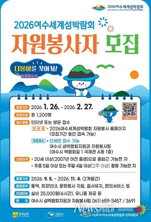 뉴스펀치 최영남 기자 | 여수시는 2026여수세계섬박람회를 함께 이끌어갈 자원봉사자 “다봉이” 1,200여 명을 오는 1월 26일부터 2월 27일까지 한 달간 모집할 예정이다.