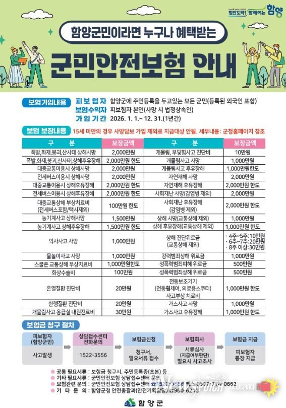 뉴스펀치 박세훈 기자 | 함양군은 군민들이 일상생활 속 각종 재난·사고로부터 보다 안전하게 보호받을 수 있도록 전 군민을 대상으로 한 ‘2026년 군민안전보험’에 가입해 운영한다고 밝혔다.