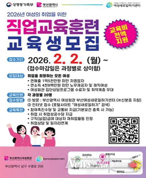 뉴스펀치 김윤걸 기자 | 부산시 여성회관은 '2026년 여성직업교육훈련'에 참가할 교육생을 모집한다고 밝혔다.