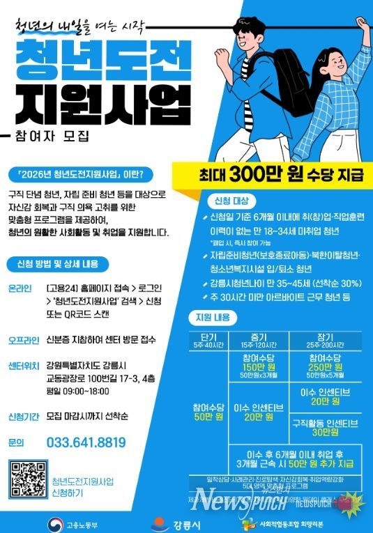 뉴스펀치 조평훈 기자 | 강릉시는 구직을 단념했거나 사회 진입에 어려움을 겪고 있는 청년들의 회복과 재도전을 지원하기 위해, ‘2026년 청년도전지원사업’ 참여자를 신규 모집하고 본격적인 사업 추진에 나선다고 밝혔다.
