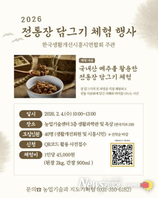 뉴스펀치 박상훈 기자 | 시흥시 여성농업인 단체 한국생활개선시흥시연합회는 우리 고유의 전통 발효식품 문화를 계승ㆍ확산하기 위해 시민과 함께하는 ‘전통 장 담그기 체험행사’를 오는 2월 4일 시흥시농업기술센터에서 연다.