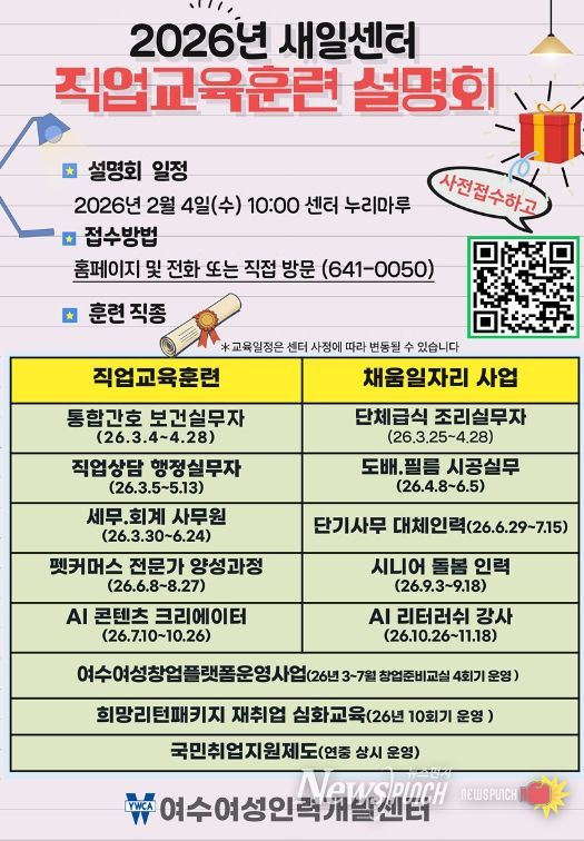 뉴스펀치 최영남 기자 | 여수여성인력개발센터(부설 여수여성새로일하기센터)는 오는 2월 4일 오전 10시, 여수여성인력개발센터 4층 누리마루 강당에서 ‘2026년 직업교육훈련 설명회’를 개최한다고 밝혔다.