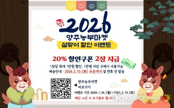 뉴스펀치 박상훈 기자 | 양주시가 운영하는 양주시 농특산물 온라인 쇼핑몰 양주농부마켓에서 다가오는 설 명절을 맞아 고객들에게 특별한 혜택을 제공하고자 설맞이 할인 이벤트를 진행한다.