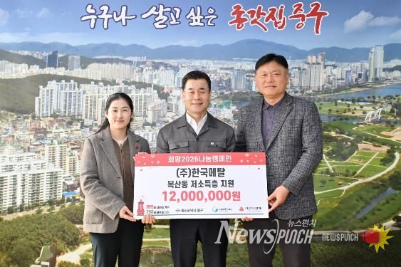 뉴스펀치 김윤걸 기자 | ㈜한국메탈이 1월 21일 오전 11시 중구청 구청장실을 방문해 울산사회복지공동모금회를 통해서 이웃돕기 후원금 1,200만 원을 전달했다.